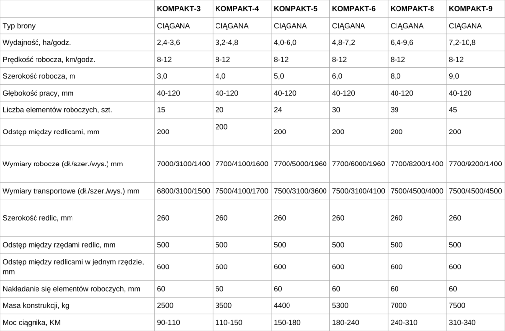 - Szerokość robocza – w zależności od konfiguracji od 3 do 9 metrów.
